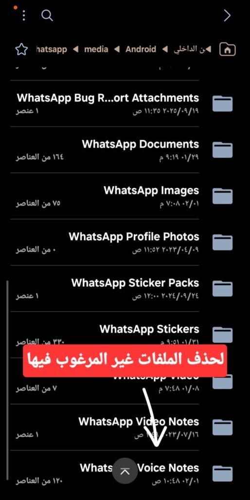- تم تطبيق كيفية الدخول إلى مجلدات الواتساب وحذف الملفات والصوتيات الغير مرغوب فيها ، وبدون التأثير على الصور أو الفيديوهات .