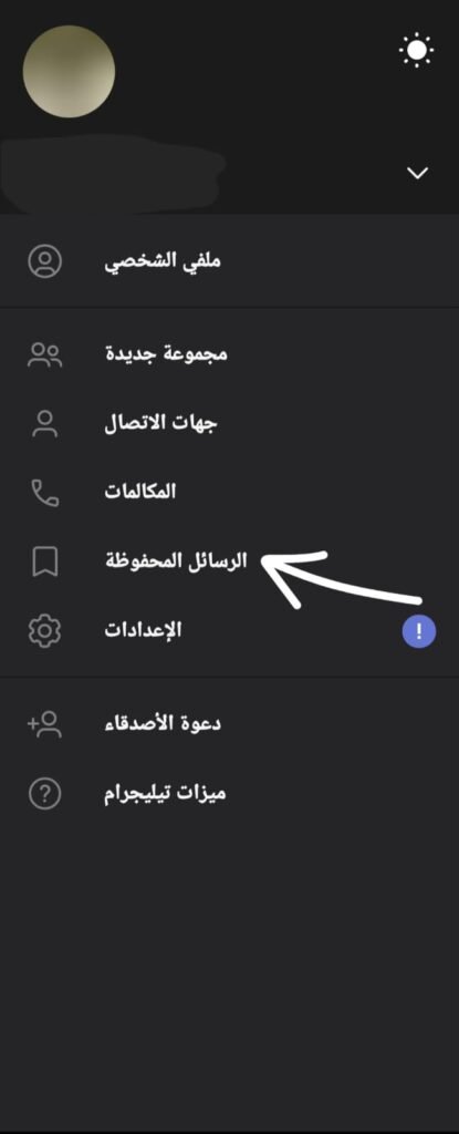 - قم بفتح تطبيق تيليجرام ثم تضغط على القائمة الجانبية ( الثلاث شرط ) واختر الرسائل المحفوظة أو ( Saved Messages ) المحادثة هذه هى المخزن الشخصى مفيش حد غيرك بيشوفها .