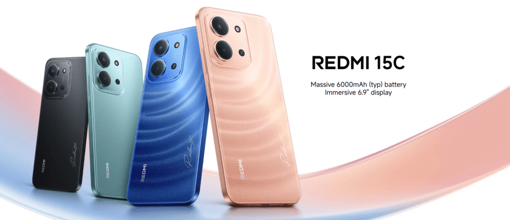 - فى Redmi 15C يأتى بأربع ألوان اللون الأخضر واللون البرتقالى واللون الرمادي واللون الأزرق .