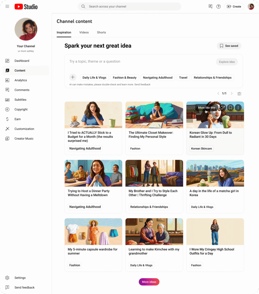 2. وداعًا لصفحة الورد البيضاء مع “Inspiration Tab” كلنا بنوصل للحظة اللي بنبقى مش عارفين نعمل الفيديو الجاي عن إيه. يوتيوب حل المشكلة دي بتاب جديد اسمه “الإلهام”. الأداة دي مش مجرد بتقترح عليك أفكار، دي بتعمل عصف ذهني معاك. بتقترح مواضيع، ولما تختار موضوع، بتديلك 9 أفكار جديدة كاملة تقدر تبني عليها خطة محتوى. والأهم من كده، مش بتسيبك تايه، دي بتقولك ليه الأفكار دي ممكن تنجح، بناءً على تحليل لسلوك جمهورك واهتماماتهم، عشان تاخد قرارك وأنت مطمن.